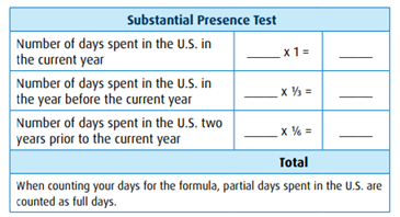 This rule is governed by the “Substantial Presence Test”, which involves a calculation to determine if the time a person spent in the U.S. qualifies them for U.S. income taxes. The following table outlines the calculation, which includes consideration of time spent in the U.S. over the previous 3 years.