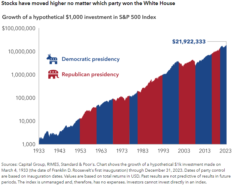 While the U.S. election can cause market volatility and impact certain sectors, it’s crucial for investors to maintain a long-term perspective and not make impulsive investment decisions based on election outcomes. After all, the stock market has historically trended upwards regardless of which party is in power. Do not let politics dictate how you invest. The adage still holds true it’s time in the market, not timing the market.